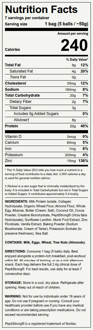 We're pairing PeptiStrong® at its full 2.4g clinical dose with creatine monohydrate, a protein blend from milk protein isolate and hydrolyzed collagen, and some zinc, making for a lean but purposeful supporting cast. The result is a snack that looks and tastes like something you'd actually want to eat, but works like a recovery formula baked into your breakfast.