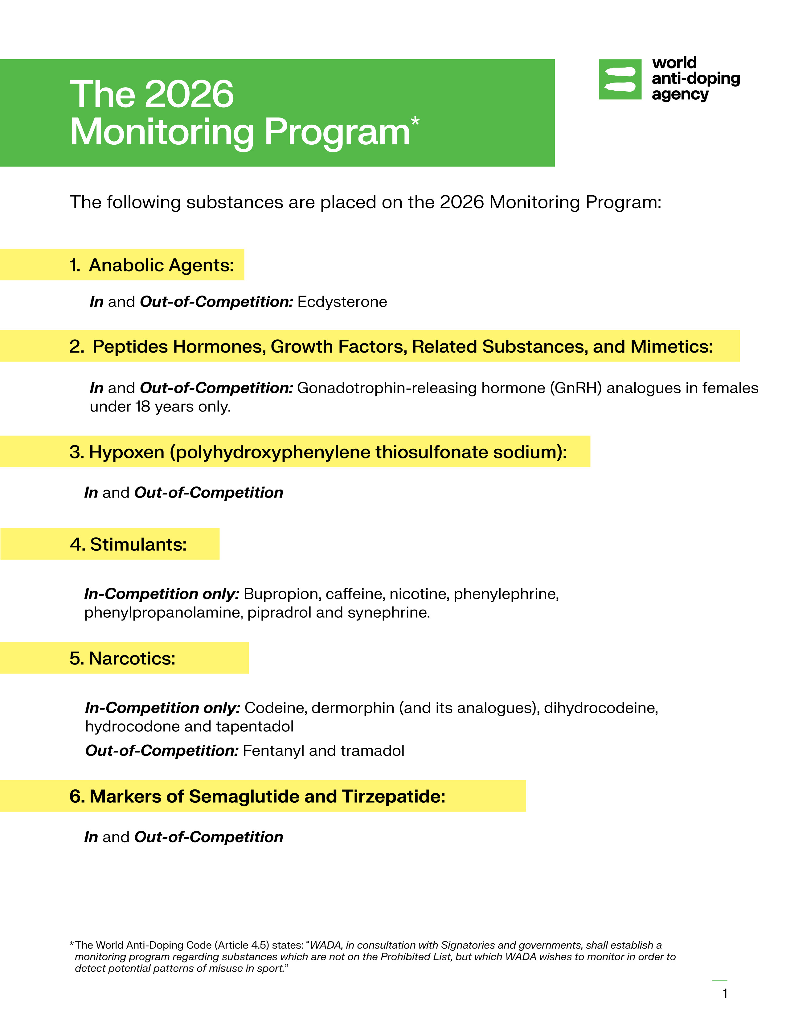 Alongside the Prohibited List, WADA maintains a Monitoring Program tracking substances not currently banned but monitored for potential patterns of misuse.[3] The 2026 program includes several noteworthy additions: