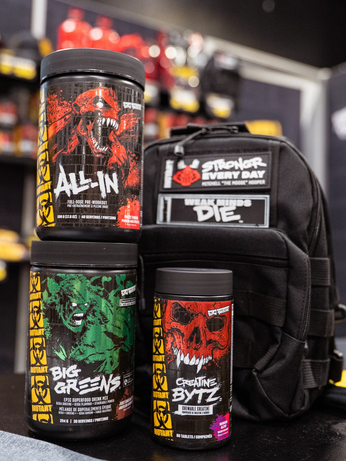 At the Arnold Classic, Mutant placed a promotional sheet on every table at the Hyatt bar. That sheet announced Mitchell "The Moose" Hooper's partnership with Mutant and the "Stronger" signature line. Spelled without the final "e" (as "STRONGR"), the line involves three product categories co-developed with Hooper and his coach, Laurence "Big Loz" Shahlaei, with a strongman and powerlifting focus.