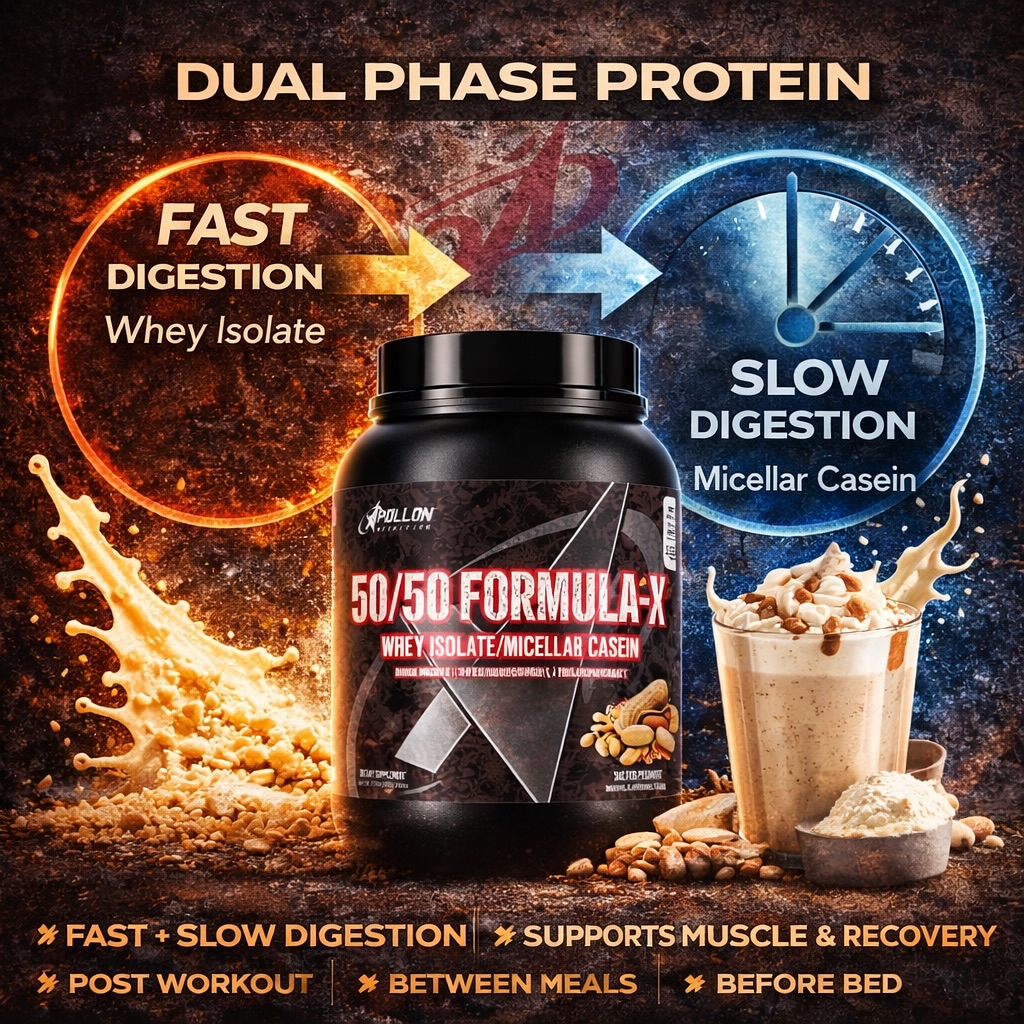 - 50/50 Formula-X — 50% whey isolate / 50% casein protein blend