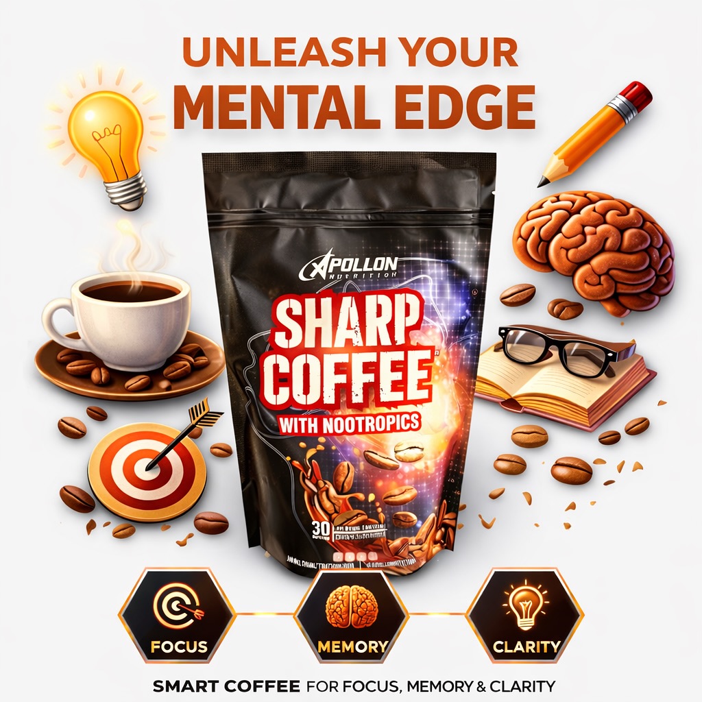 Sharp Coffee gets genuine enthusiasm from both Mike and Robik. It's a dehydrated instant coffee product spiked with tyrosine, citicoline, and Huperzine A -- each gram delivers 50mg caffeine equivalent, so the 7g full scoop hits 350mg. Mike uses it at about a 2.5g scoop (125mg caffeine). Robik uses it as his go-to because he moves fast and doesn't want to brew anything -- he adds sugar-free creamer and goes.