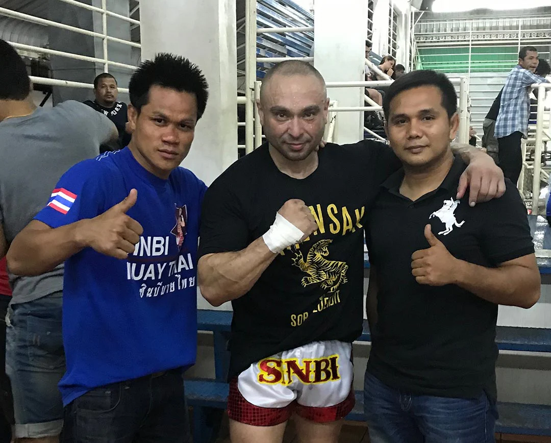 About a year into training with Ken Sak, Robik told him he wanted to visit Thailand. Ken offered to set up a fight instead. Robik went, won, and never looked back. He won roughly eight or nine fights in total, all of them in Muay Thai, fighting from age 36 until 43 or 44. The career high point was a title fight at Bangla Stadium in Patong, Thailand.