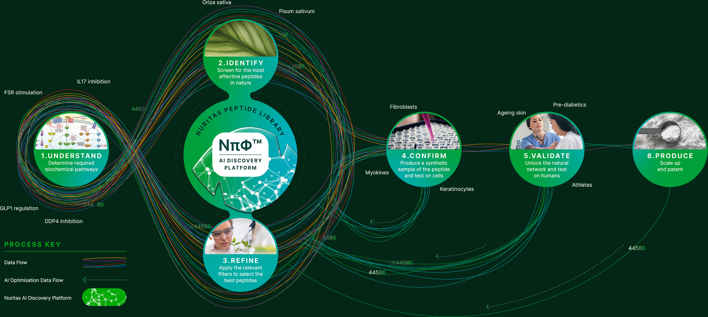 Nuritas' proprietary AI platform that screens billions of peptide possibilities and compresses decades of traditional research into months, from understanding biological pathways through scaled production.