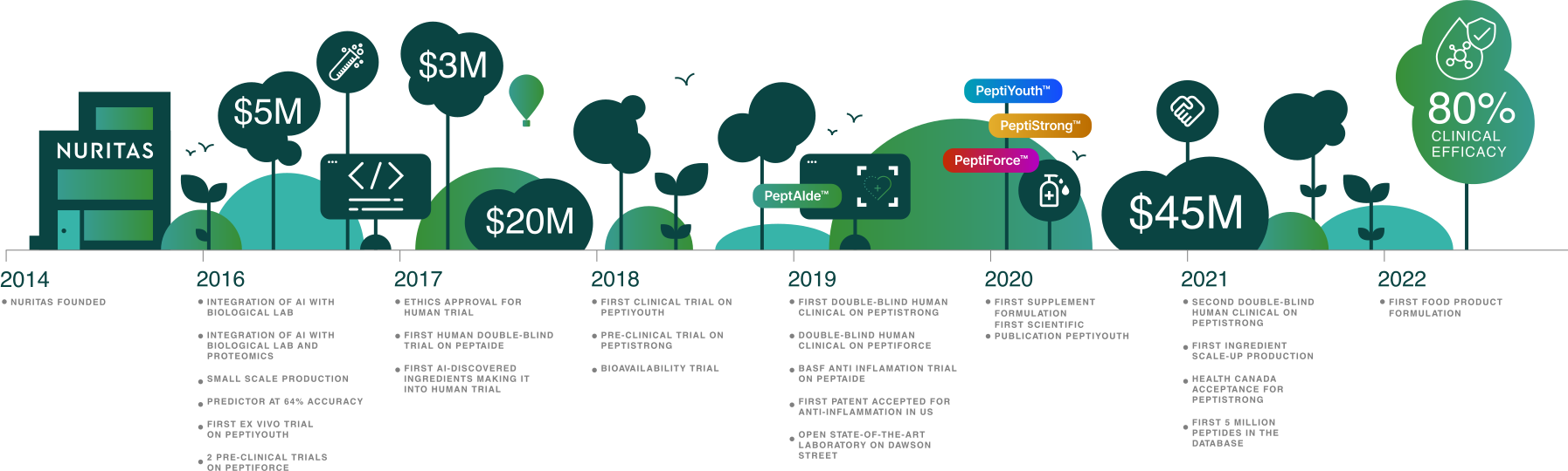 From founding through major funding rounds and ingredient launches, this timeline tracks Nuritas' rapid scaling, including over $70 million raised and the development of PeptiStrong, PeptiYouth, and PeptiForce.