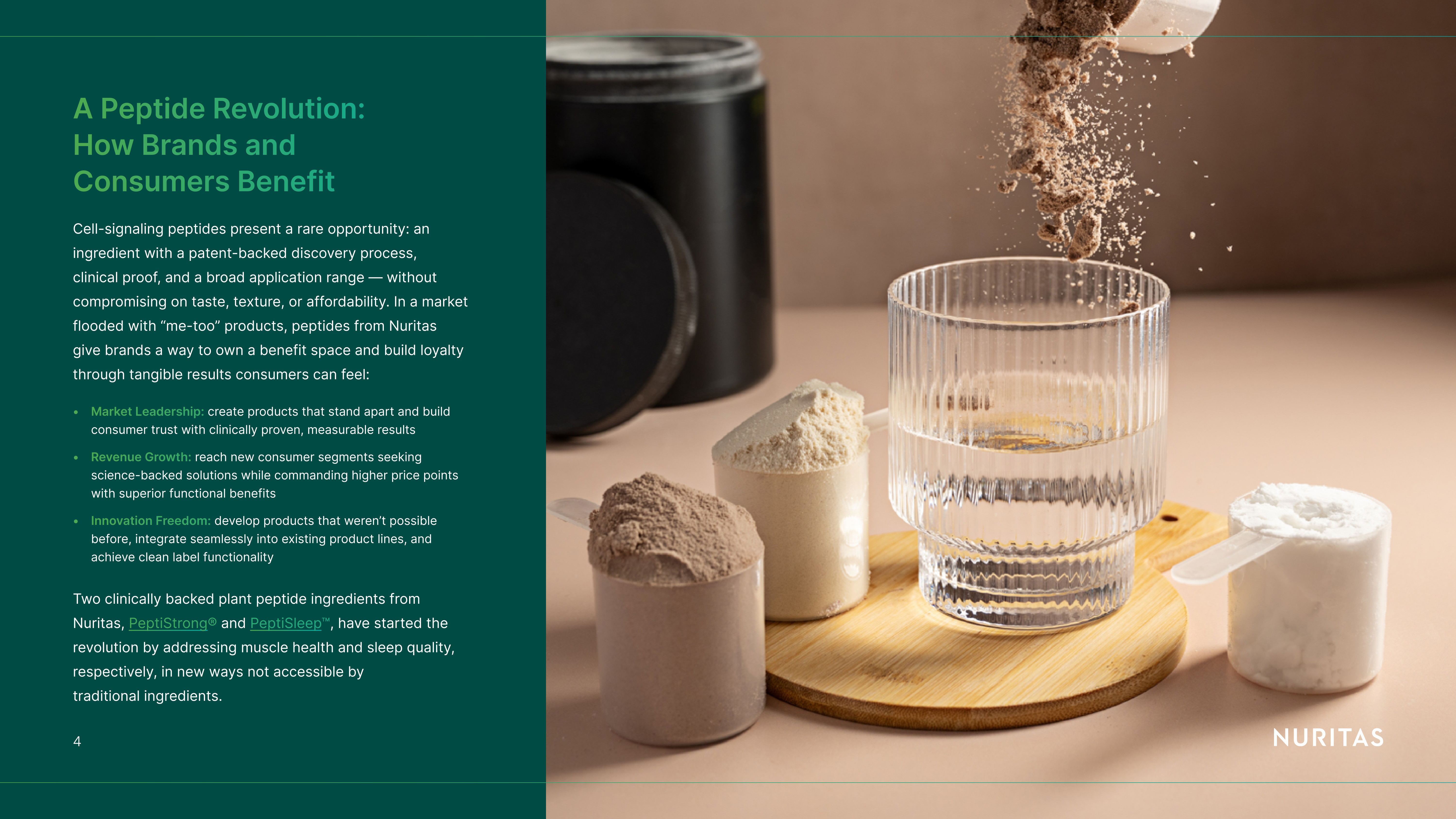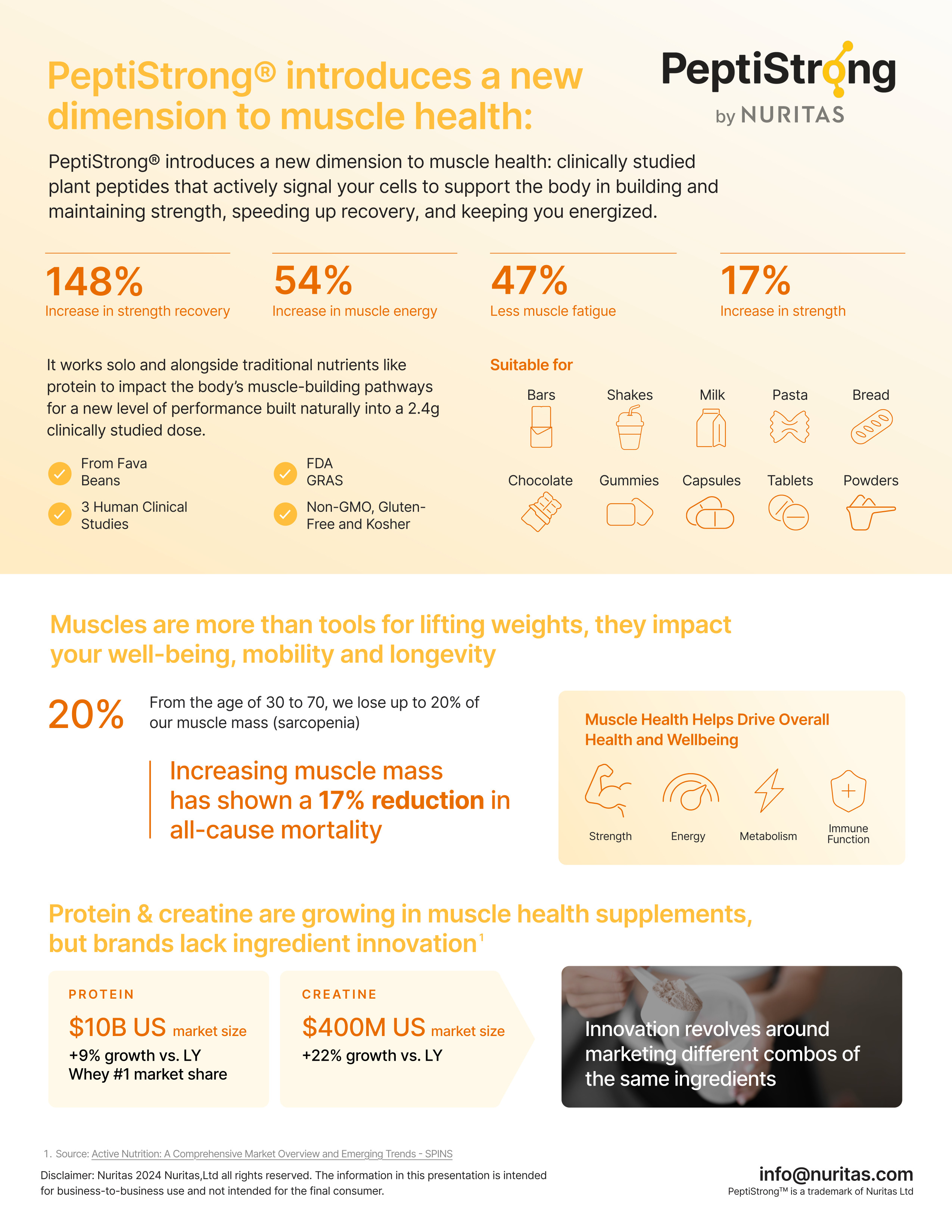 Cell-signaling peptides from Nuritas give brands differentiation opportunities through patent-backed discovery and clinical proof without compromising formulation flexibility. PeptiStrong and PeptiSleep address muscle health and sleep quality in ways traditional ingredients cannot achieve.