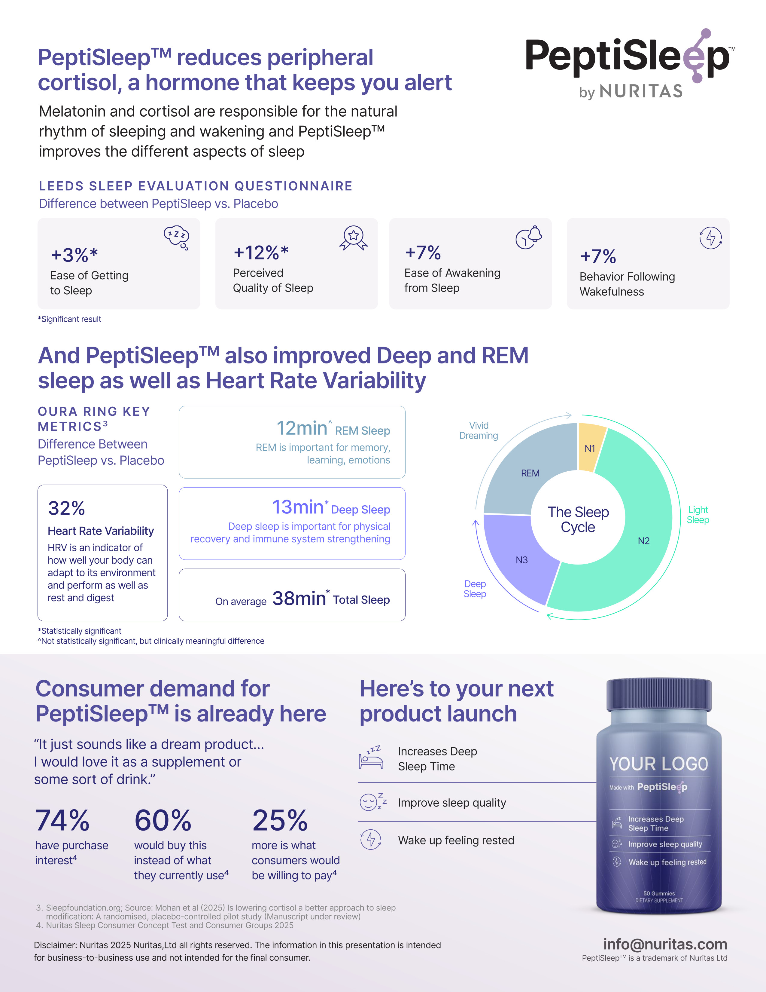 In a market saturated with melatonin products, PeptiSleep™ offers brands a genuine differentiation point with measurable benefits that show up on sleep tracking wearables.