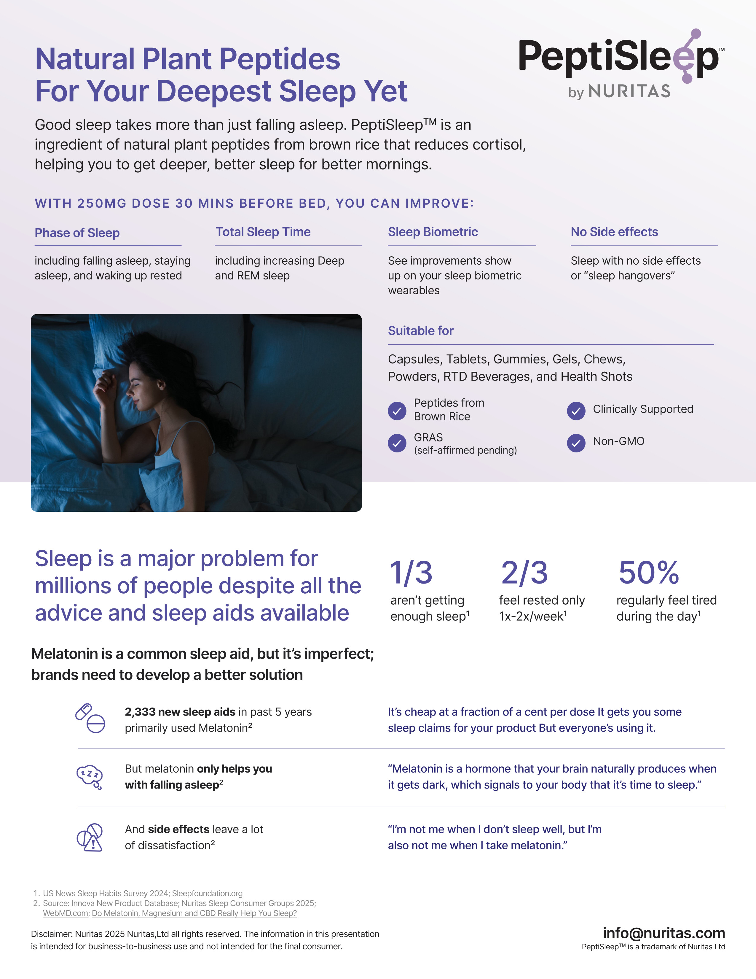 PeptiSleep™ is GRAS (self-affirmed), non-GMO, and derived from brown rice peptides. It works in capsules, tablets, gummies, gels, chews, powders, RTD beverages, and health shots. It also pairs well with other sleep ingredients like L-theanine, magnesium, and glycine.