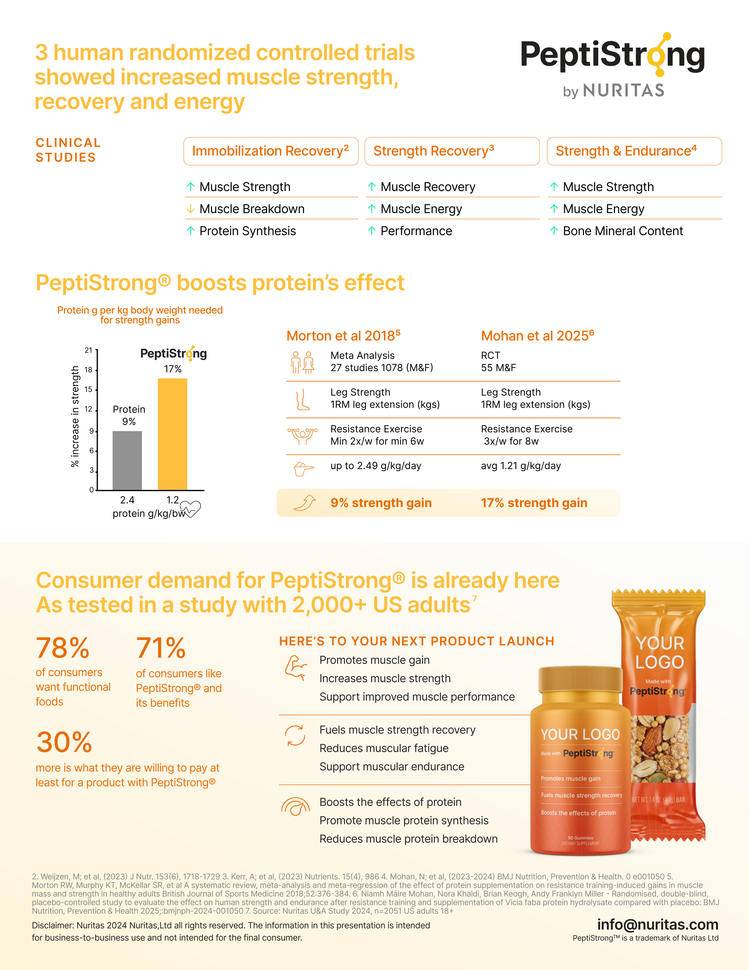 PeptiStrong clinical data shows 17% strength gains while amplifying protein's effectiveness at lower doses. Consumer research reveals 78% want functional foods and 71% are interested in PeptiStrong specifically, supporting a 30% price premium.