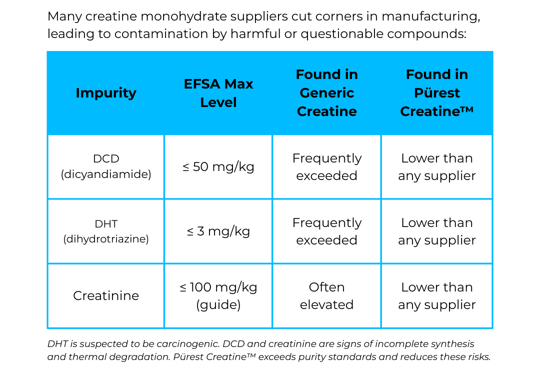 The International Society of Sports Nutrition's position stand affirms that creatine monohydrate is safe when consumed at recommended dosages, with long-term studies extending up to five years showing no adverse effects on kidney or liver function in healthy individuals.[2] However, this safety profile assumes high manufacturing purity: free from DCD, DHT, heavy metals, and excessive creatinine. That's normally what the studies get (highly-tested, pure material from the most prominent chemical companies), but is it what's in everyone's generic creatine supplement?