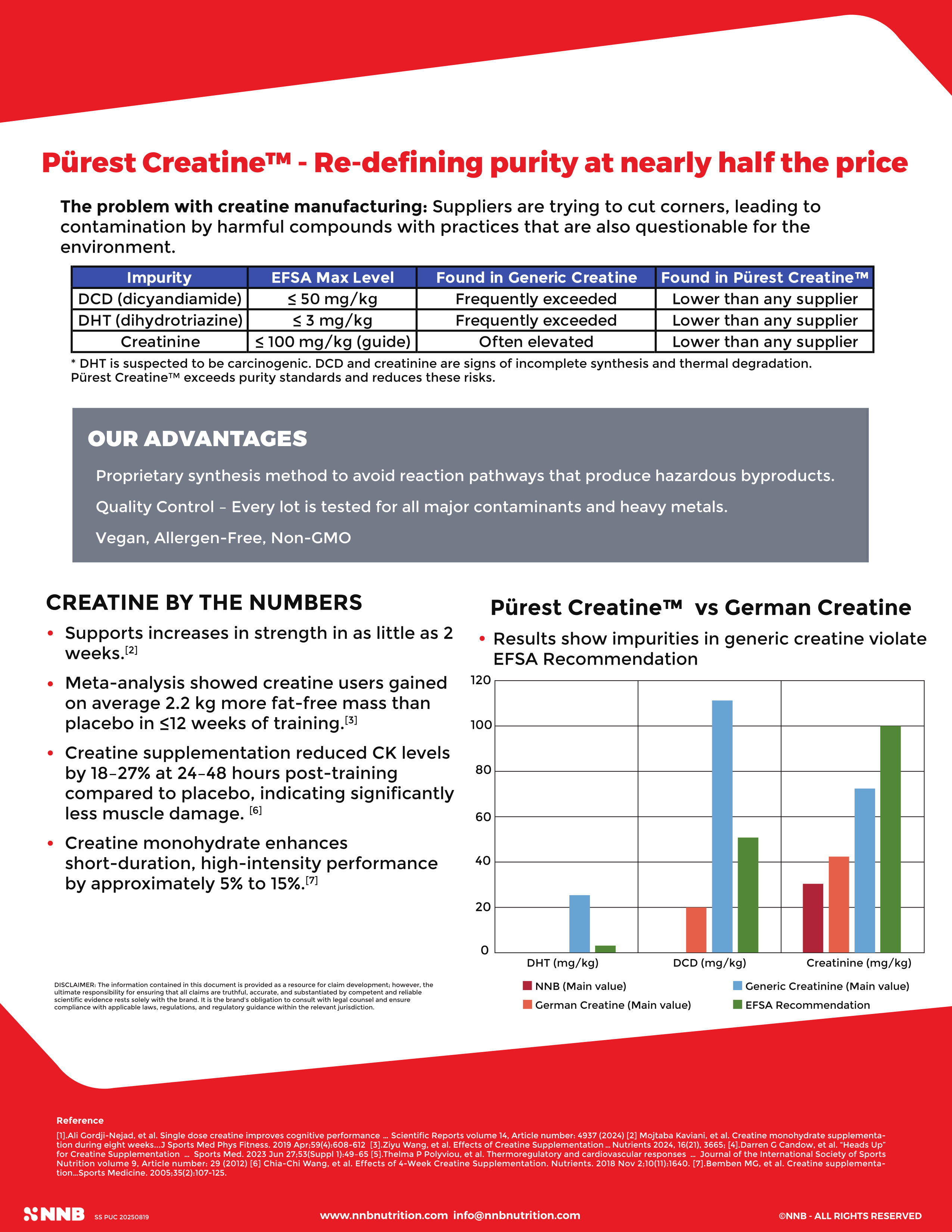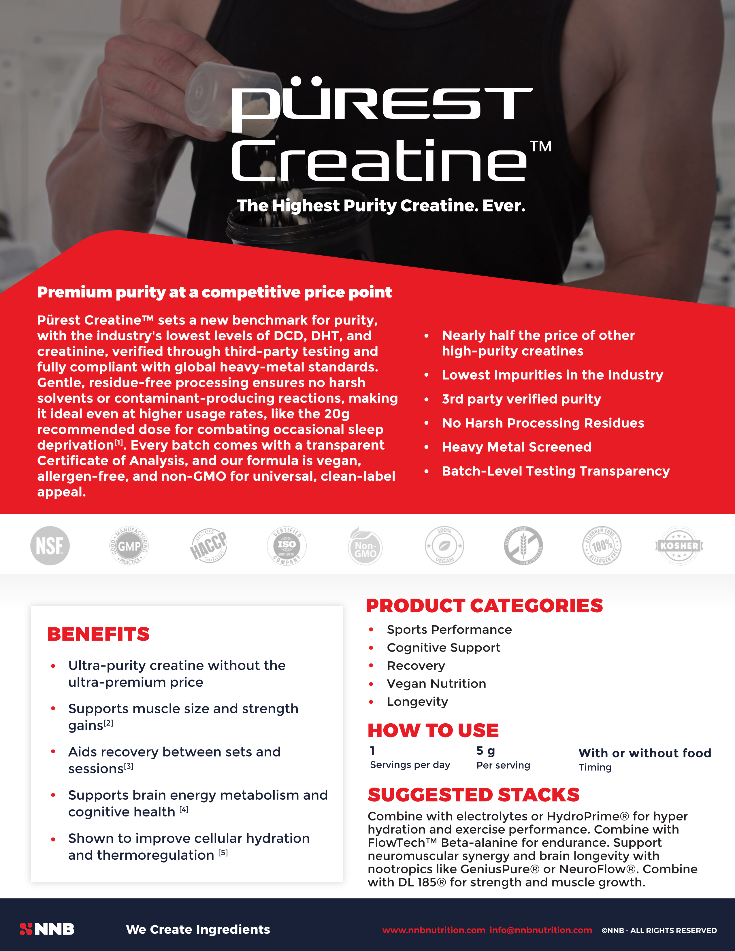 NNB Nutrition is addressing this issue head-on with the launch of Pürest Creatine, debuting at SupplySide Global 2025. The new ingredient sets an industry benchmark, achieving the lowest levels of dicyandiamide (DCD), dihydrotriazine (DHT), and creatinine, all verified through third-party testing and supported by transparent certificates of analysis for every production lot. The value proposition is compelling: premium purity at nearly half the price of other high-purity creatine sources.