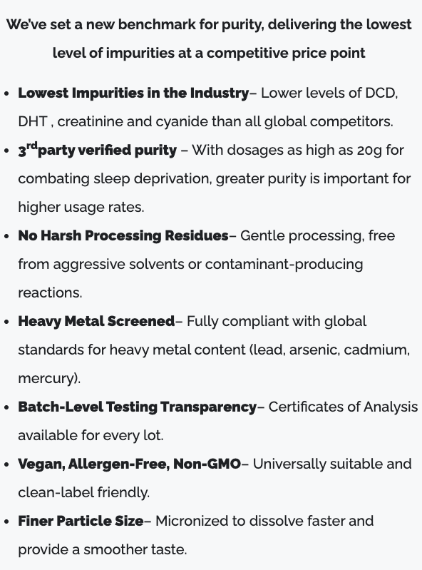 The value proposition extends beyond raw material costs. Brands using Pürest Creatine gain access to marketing-friendly messaging around purity, transparency, and quality control... attributes that resonate with educated consumers who understand the creatine quality spectrum.