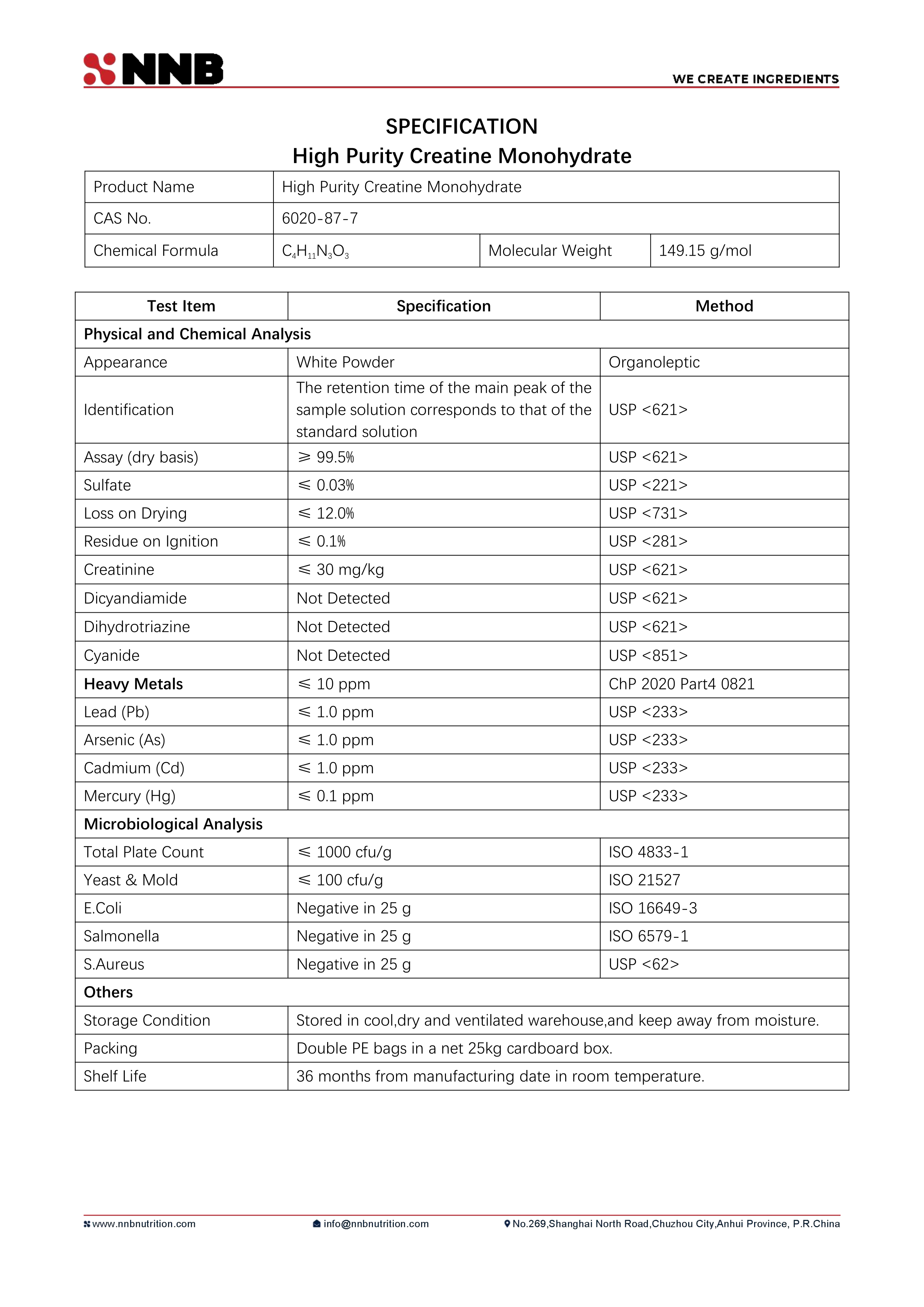 NNB Nutrition's marketing material highlighting their premium creatine ingredient's key selling points, including ultra-low impurity levels, competitive pricing, and versatile applications across sports nutrition and cognitive health formulations.