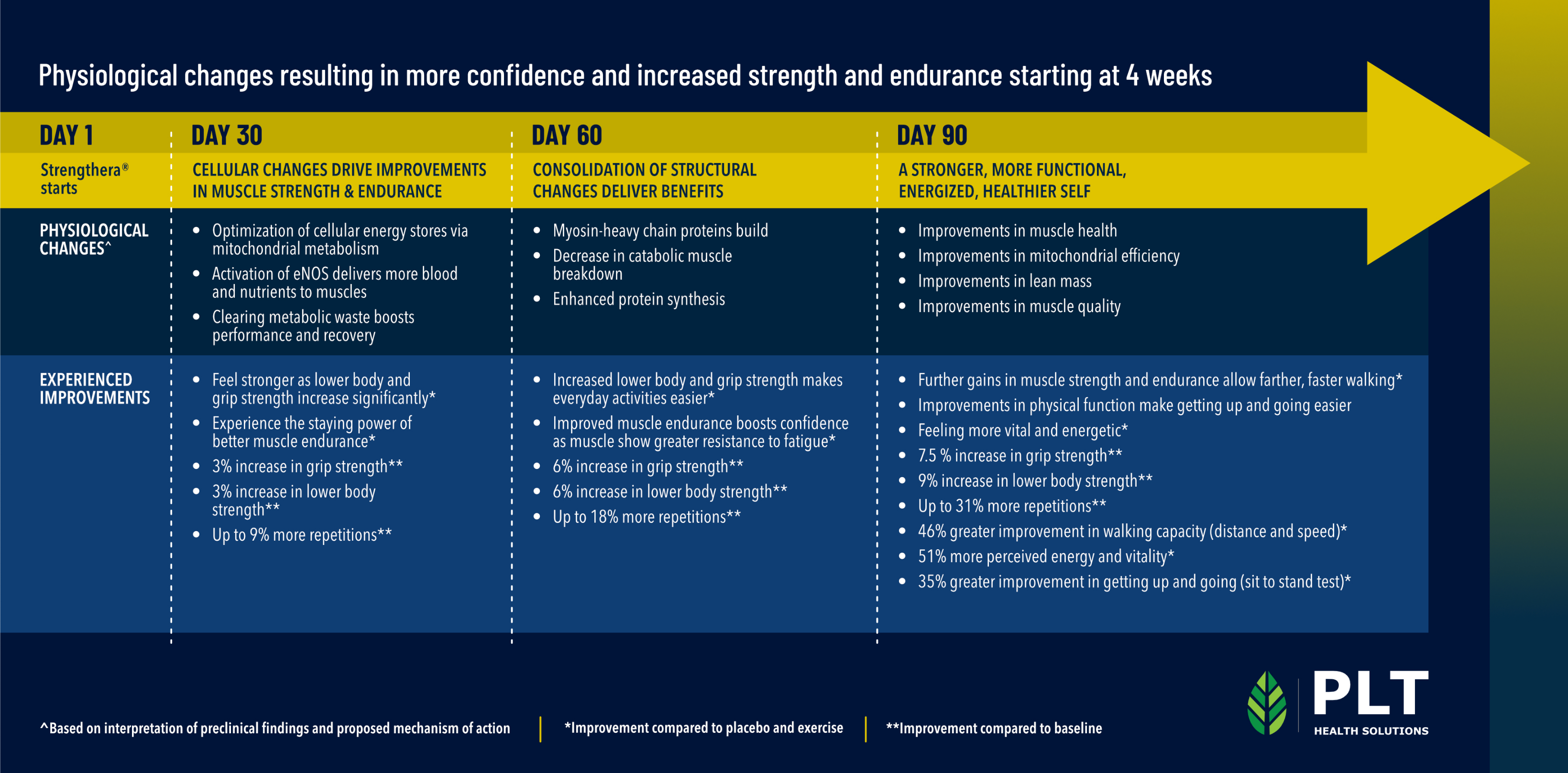 Strengthera is PLT Health Solutions' answer to that problem. This patented botanical blend was developed specifically to support muscle maintenance, strength, and physical function in aging adults. A 12-week placebo-controlled trial in adults ages 55-70 showed 4.2x greater improvement in lower body strength and 4.5x greater improvement in grip strength versus exercise alone, with measurable results starting at four weeks.