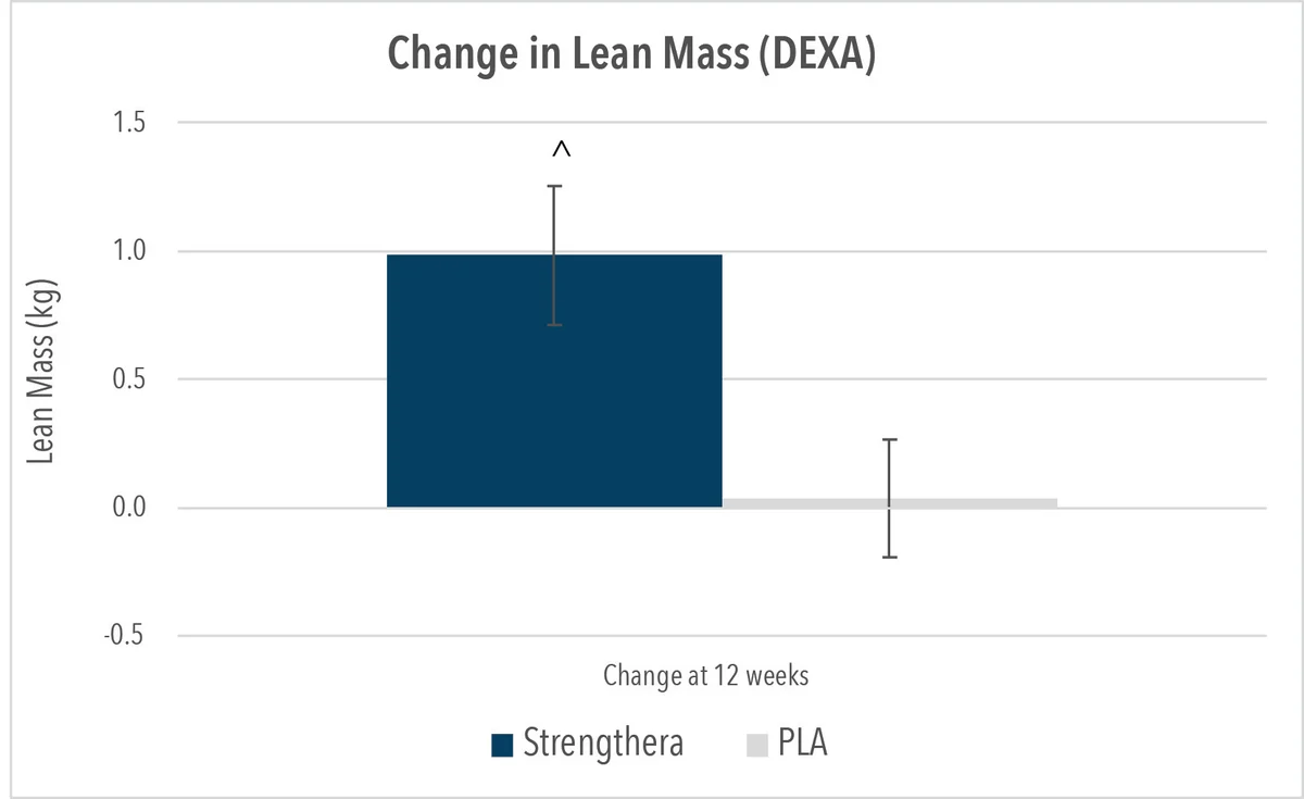DEXA scanning showed the Strengthera group gained roughly 1kg of lean mass over 12 weeks while the placebo group stayed near zero, a statistically significant difference in change scores.
