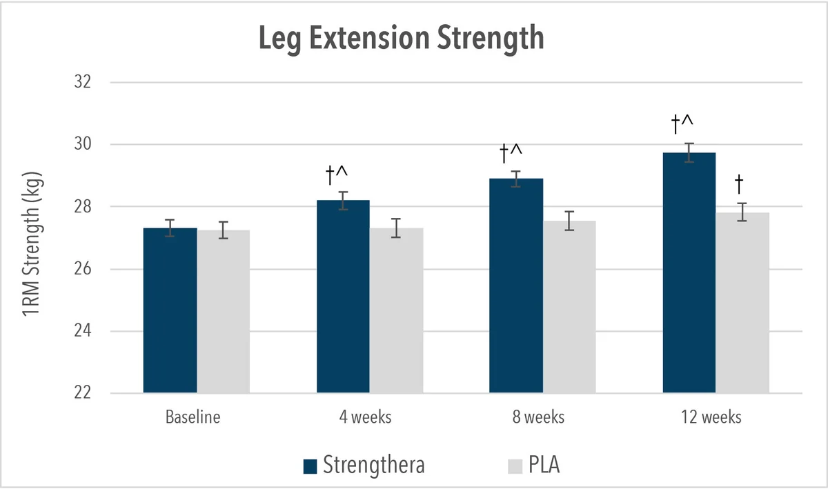 - Muscle strength improved in the Strengthera group versus both baseline and placebo starting at the four-week mark, the earliest measurement. By week 12, the Strengthera group improved leg extension strength 4.2x more than the exercise-only placebo group. Grip strength improvement was 4.5x greater in the Strengthera group (1.9kg vs. 0.42kg).