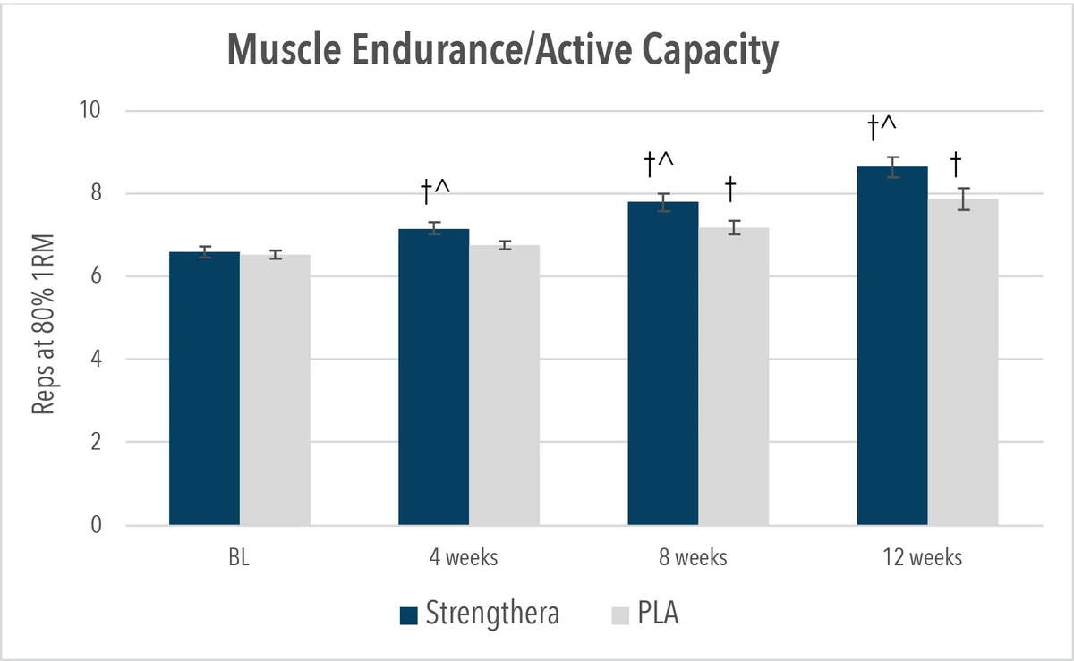 Measured as reps completed at 80% of one-rep max, Strengthera users had 50% greater active capacity than the placebo group by week 12, with significant differences at weeks 4, 8, and 12.