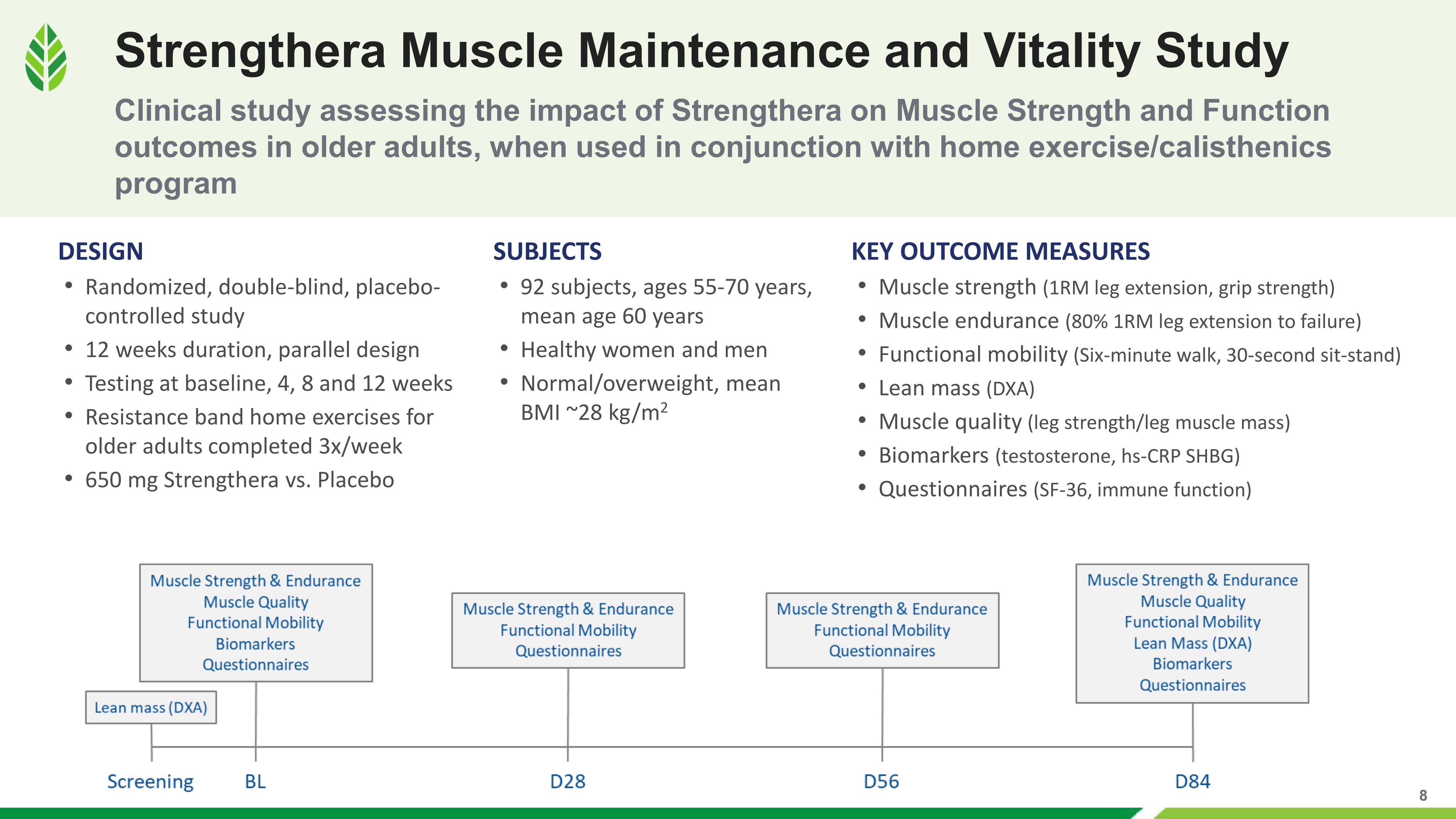 The 12-week randomized, double-blind, placebo-controlled trial enrolled 92 adults ages 55 to 70, testing 650mg Strengthera against placebo across strength, endurance, functional mobility, lean mass, and biomarker outcomes at four timepoints.