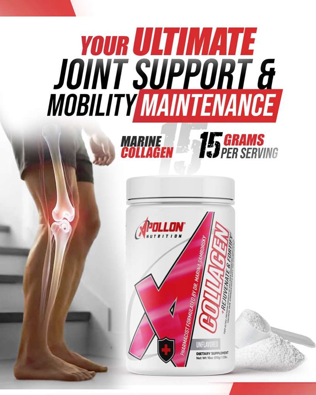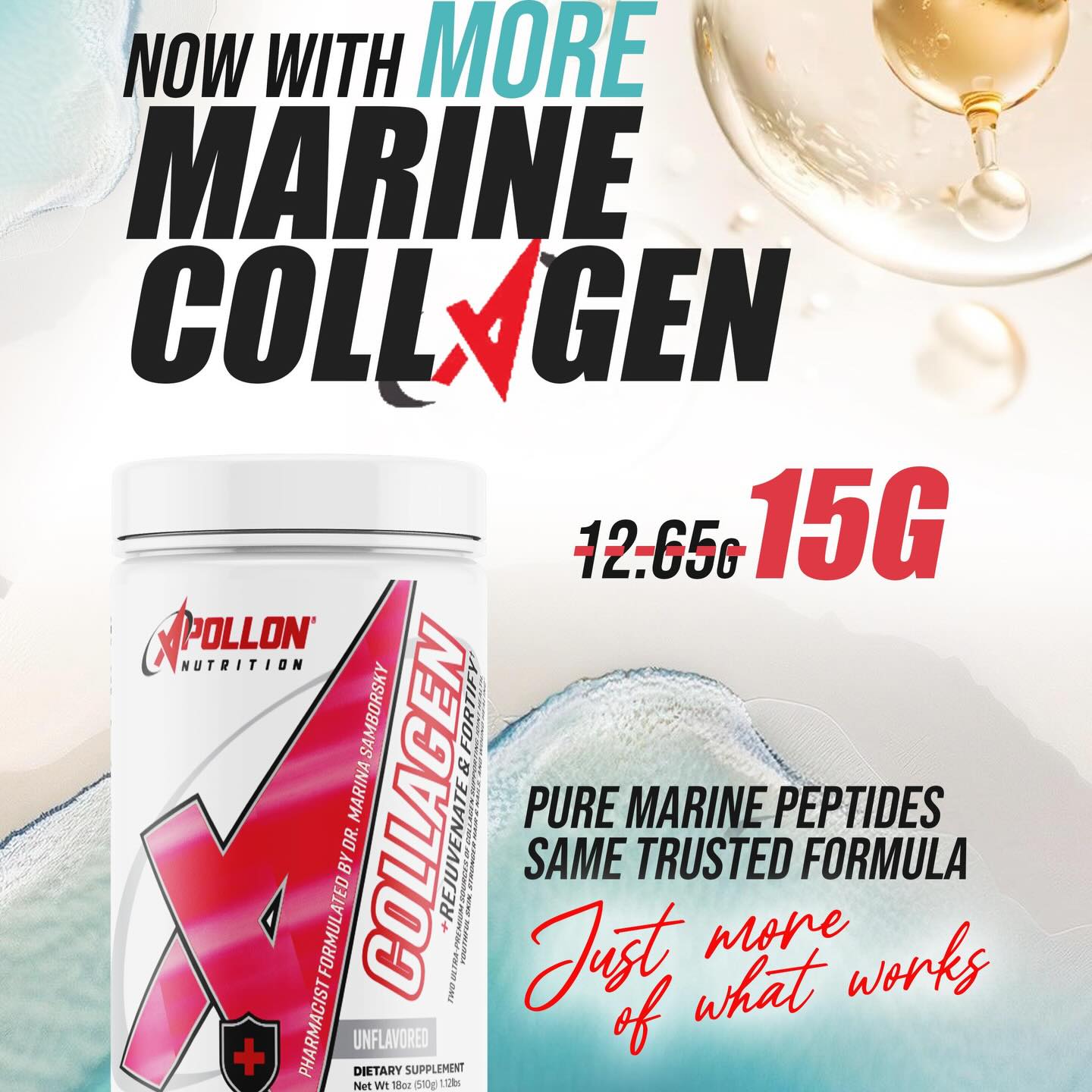 Apollon Nutrition Collagen isn't plain marine collagen powder. Formulated by Dr. Marina Samborsky, PharmD, it layers five active ingredients around a full 15g marine collagen base with the same no-compromise approach Apollon took in the 26-ingredient Specialist organ health formula. One scoop. Unflavored. 30 servings.