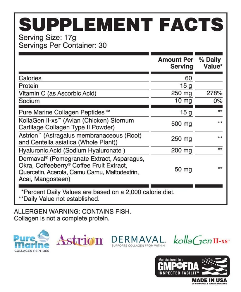 The 15g marine collagen base supplies the type I and type III collagen substrate your tendons, ligaments, and skin need directly. But that's not enough: 500mg of KollaGen II-xs™ targets joint cartilage through a separate immunological mechanism using undenatured type II collagen. Nuliv Science's Astrion™ shifts from exogenous supply to endogenous production, stimulating your body's own collagen synthesis pathways. Dermaval® works on defense, blocking activity that degrades existing collagen and elastin. Hyaluronic acid maintains the synovial environment your joints need to function under load. And Vitamin C ties the biosynthesis side together as the rate-limiting cofactor for collagen cross-linking.