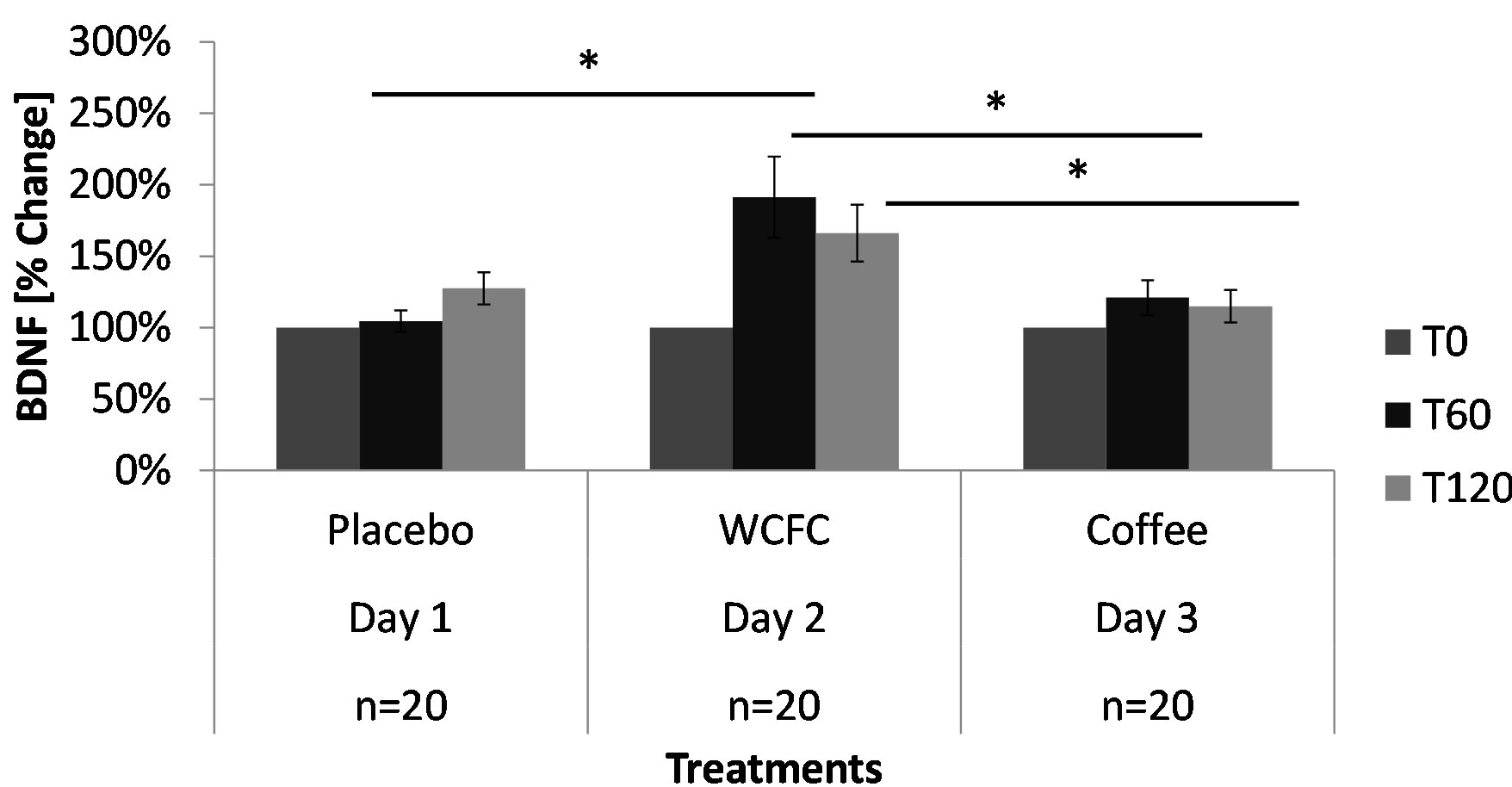 Study participants showed a notable spike in brain-derived neurotrophic factor within one hour of consuming 100mg of whole coffee fruit concentrate, with the effect substantially outperforming both placebo and regular brewed coffee. This neuroplasticity marker remained elevated for two hours after supplementation.[2]