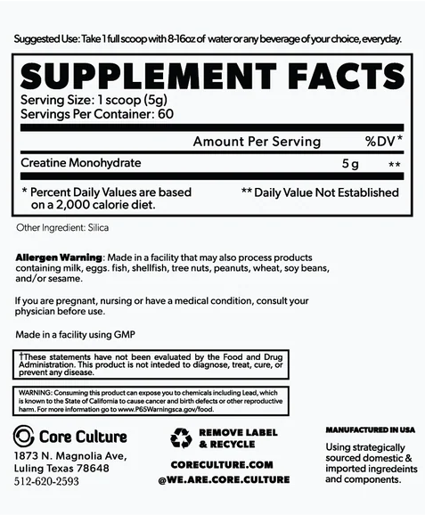 Core Culture Creatine proves that simplicity and quality don't have to be mutually exclusive. Five grams of creatine monohydrate, manufactured in an NSF-certified facility with complete transparency about processes and sourcing. That's the formula.