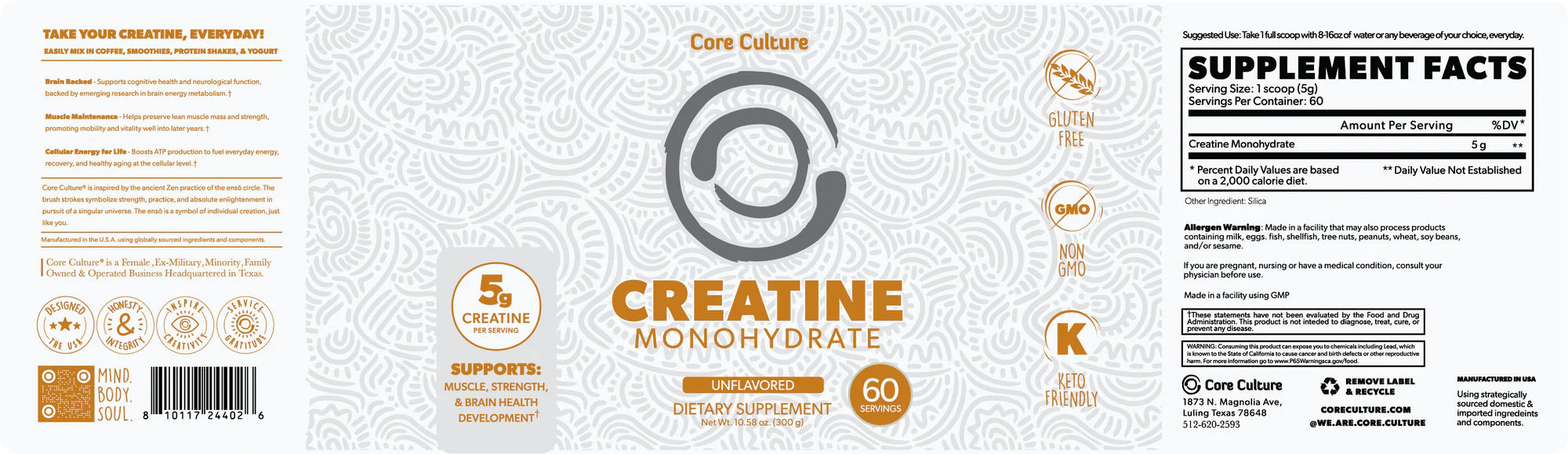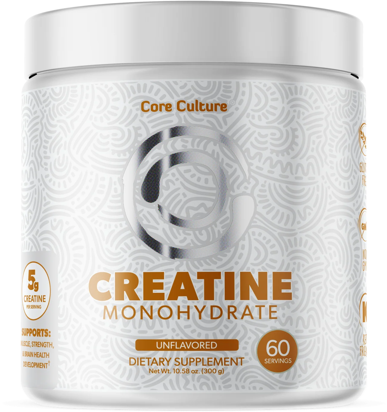 Core Culture Creatine Monohydrate delivers 5g of pure creatine per serving, manufactured at NSF-certified Veritacor in Texas. No fillers, no fluff--just research-backed support for muscle, cognition, and cellular energy. 60 servings of transparency.