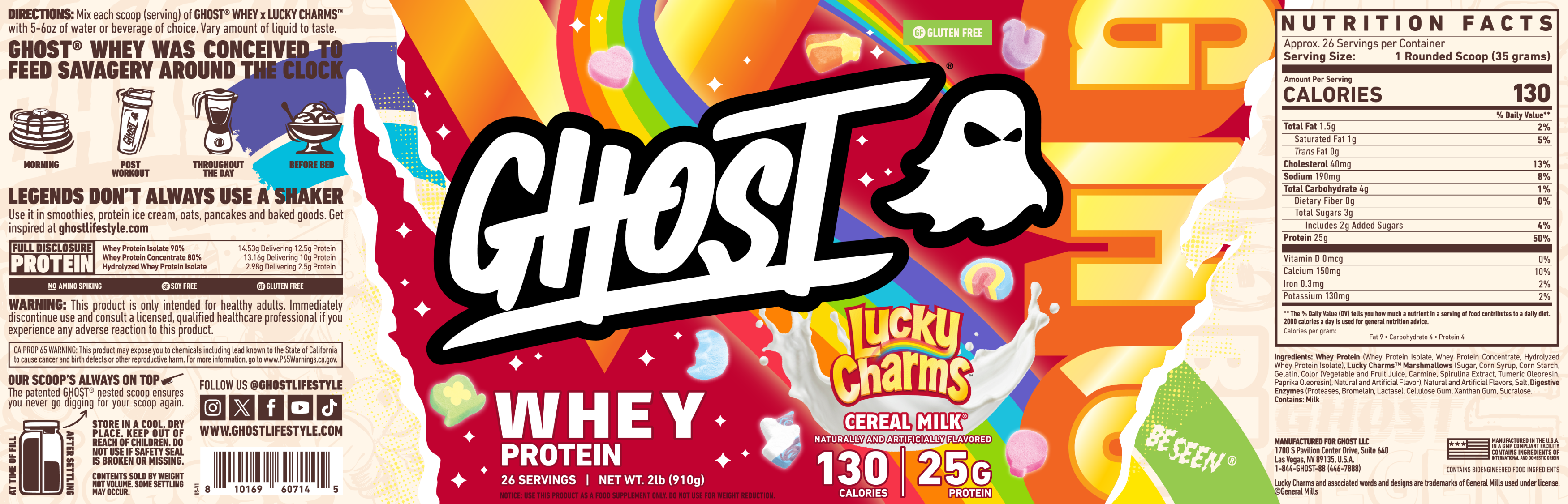 Lucky Charms Cereal Milk is the standout here -- and not just because of the rainbow label. GHOST actually included real Lucky Charms magical marshmallows in the formula, which shows up in the ingredient panel (Sugar, Corn Syrup, Dextrose, Gelatin, natural colors from vegetable juice, carmine, spirulina, and turmeric). That's the same marshmallow magic you'd expect from the cereal itself.