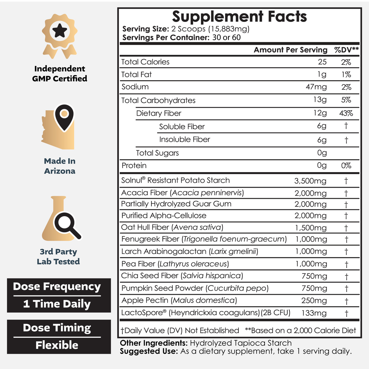 Nootropics Depot built this formula with the same pharmaceutical-grade rigor we detailed in our feature Inside Nootropics Depot's Pharmaceutical-Grade Labs. Every ingredient was identity-tested through modern methods, and the finished product was then verified by an independent third-party lab, confirming 12.246g of actual dietary fiber per serving against a 12g label claim. That kind of precision is rare in this category.