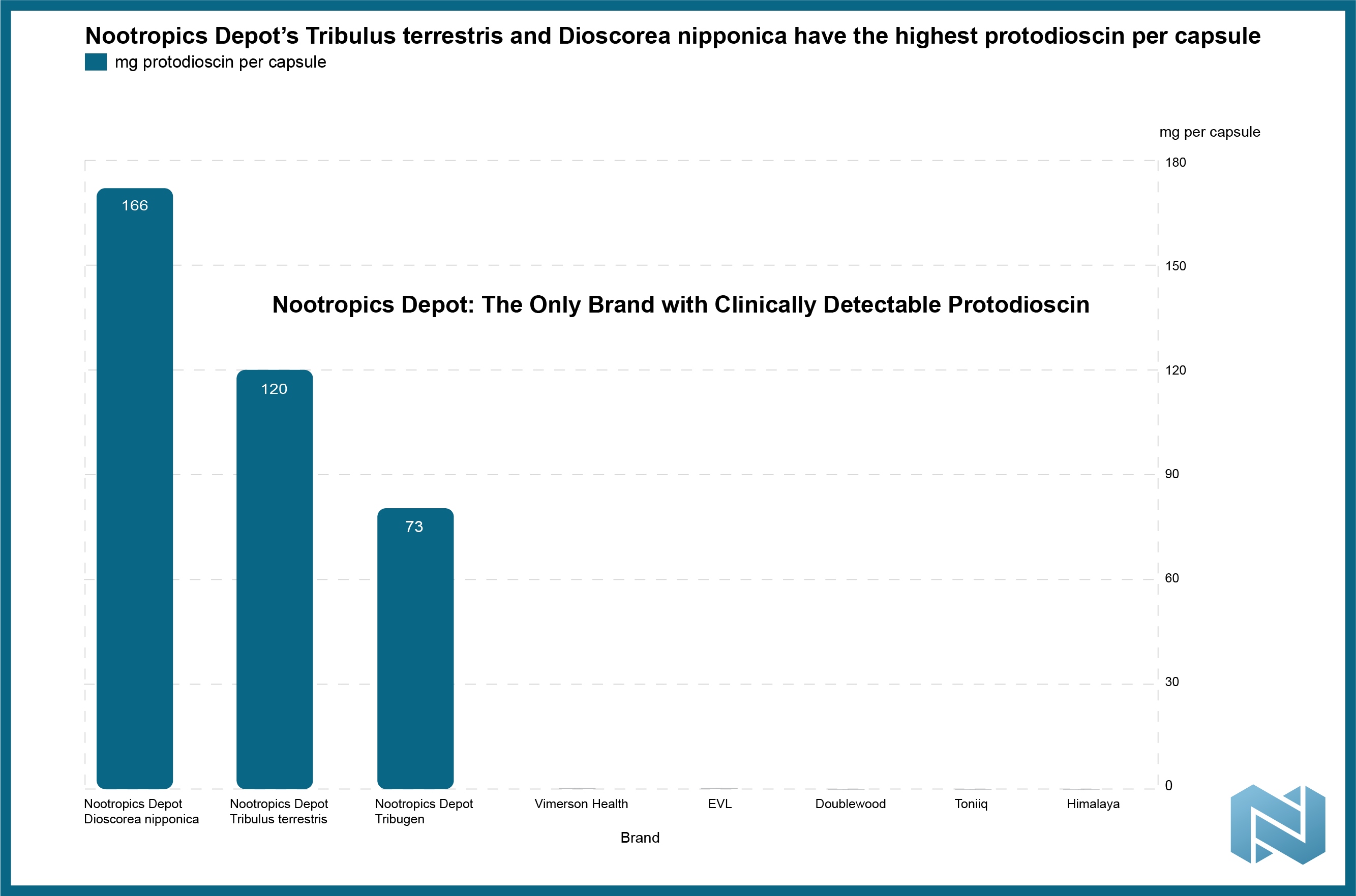 Dioscorea nipponica is the superior choice for reliable protodioscin delivery, providing 80mg of this critical compound per serving. While traditional Tribulus terrestris extracts suffer from wildly inconsistent protodioscin content (often containing minimal amounts despite high "saponin" standardizations), Dioscorea nipponica root offers dependable yields and consistent potency.