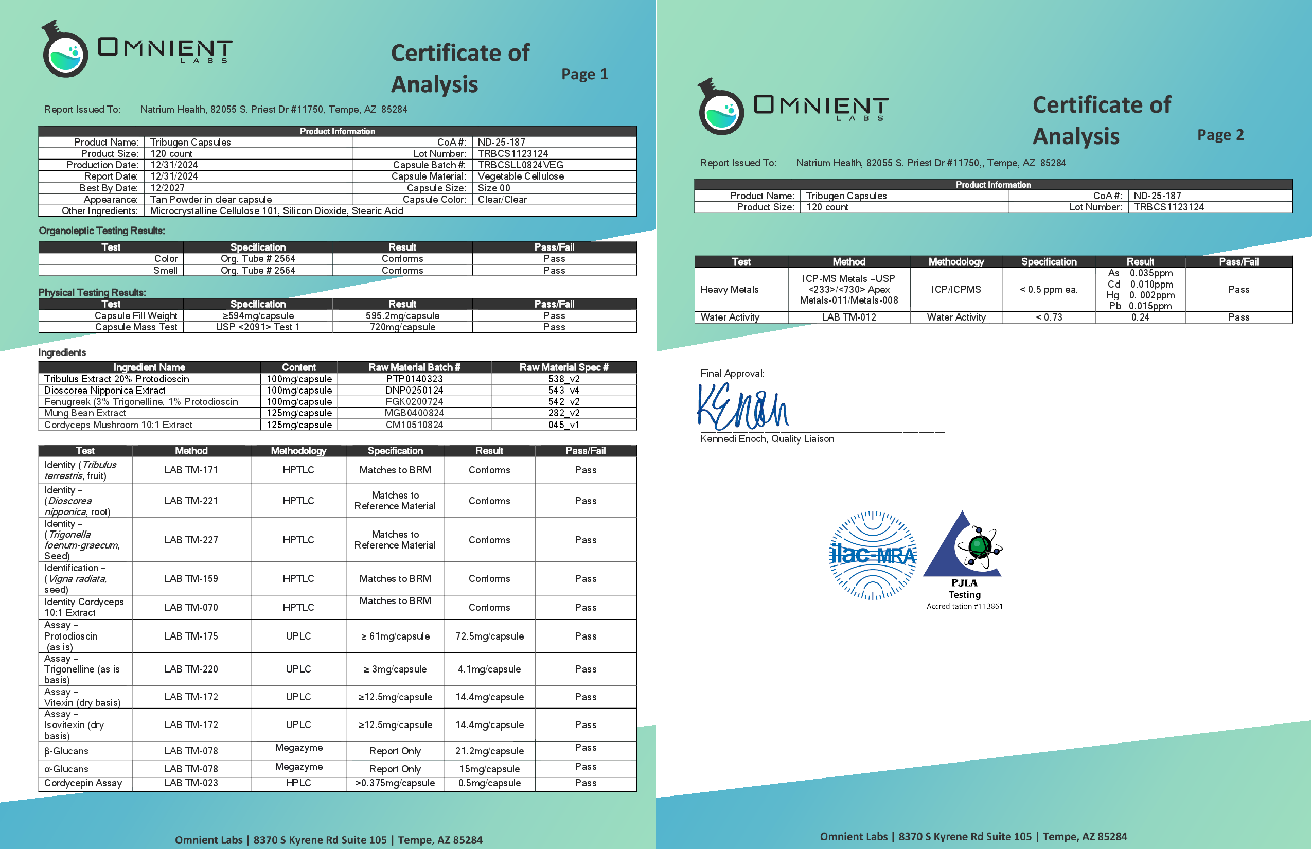 Third-party laboratory verification confirms each of Tribugen's five botanical ingredients meets potency specifications, with comprehensive testing for identity, purity, and heavy metals through ISO-accredited facilities.