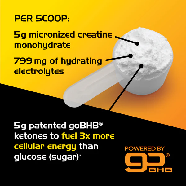 The formula is built around Ketone Labs' patented goBHB ketones, in a blend that delivers beta-hydroxybutyrate (BHB) bound to three essential minerals: calcium, sodium, and magnesium. BHB functions as an alternative fuel source that your mitochondria can convert directly into ATP, the cellular energy currency. When paired with creatine's role in rapidly regenerating ATP during high-intensity efforts, you're covering both immediate power output and sustained metabolic fuel.