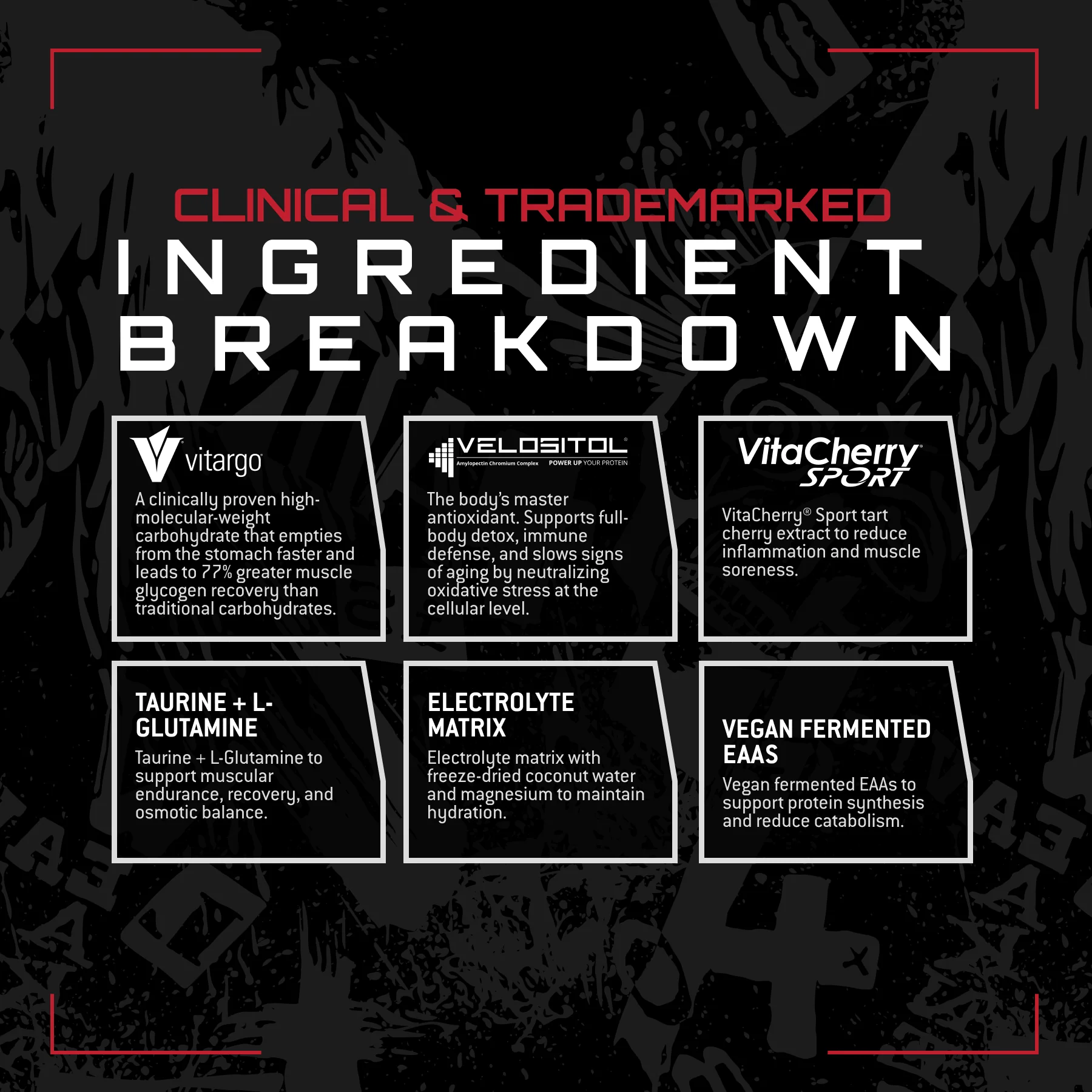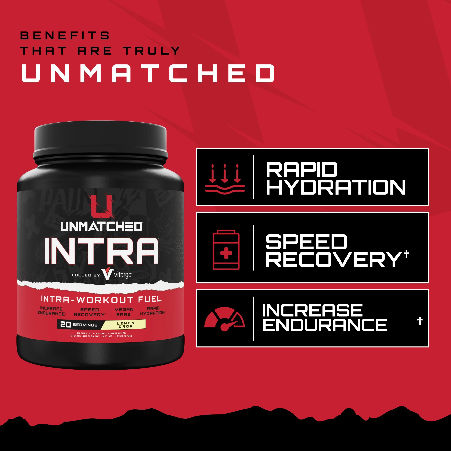 Unmatched Supps INTRA brings 25g Vitargo, 5g vegan fermented EAAs, Velositol, and VitaCherry Sport to fuel your training sessions. Rapid-acting carbs meet muscle-sparing aminos for performance when it matters most. No artificial colors or sweeteners.