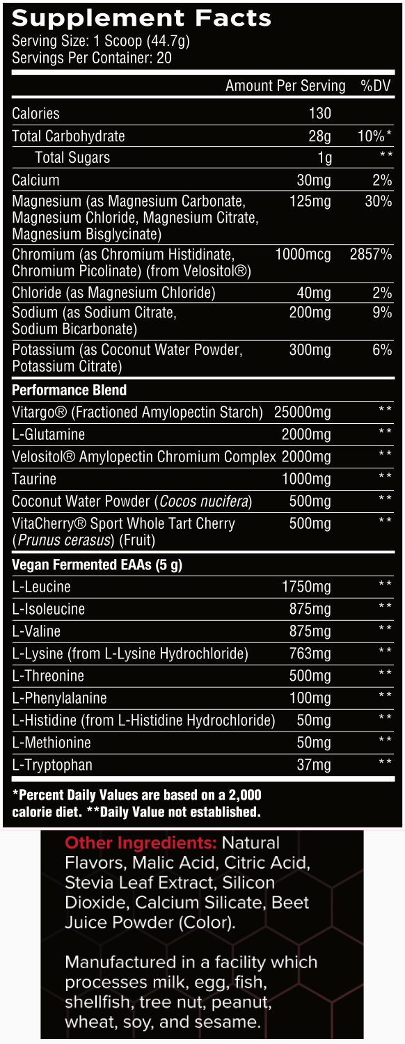 Each serving (1 scoop, 40.3g) delivers 110 calories, 26g total carbohydrates, and a solid electrolyte matrix including 200mg sodium, 300mg potassium, 125mg magnesium, and 1000mcg chromium (from Velositol).