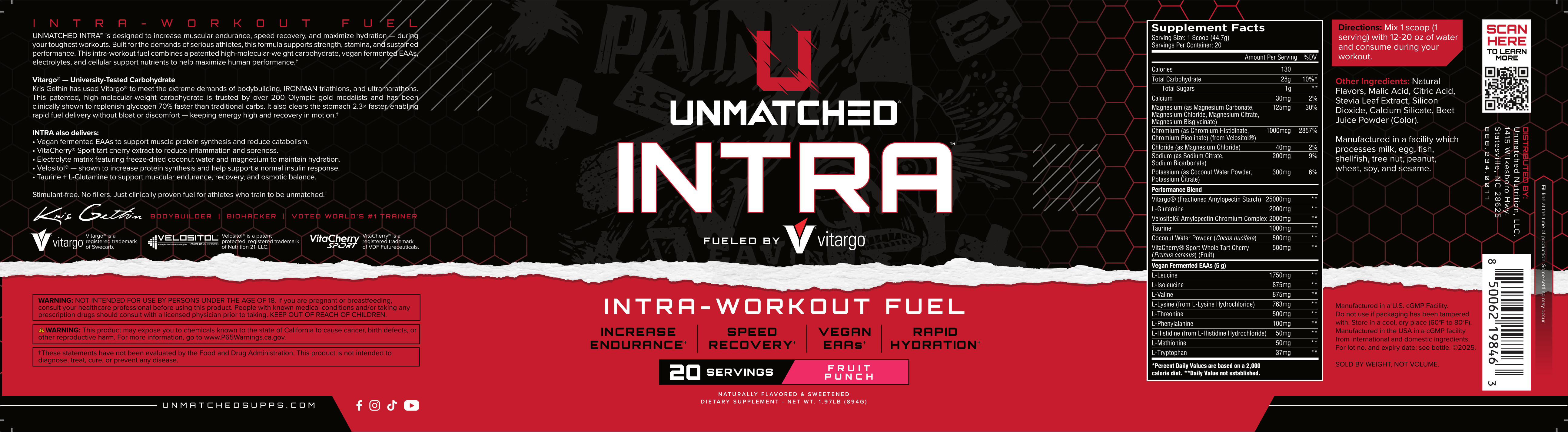 Unmatched Supps INTRA represents exactly what we've come to expect from Kris Gethin and Doug Miller: massive solutions backed by quality ingredients at meaningful doses. The 25g Vitargo base provides the rapid gastric emptying and efficient glycogen replenishment that serious athletes need, while the EAA profile and supporting ingredients create a complete intra-workout system.
