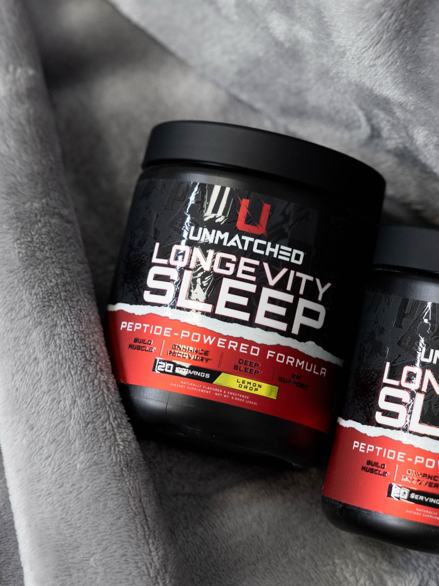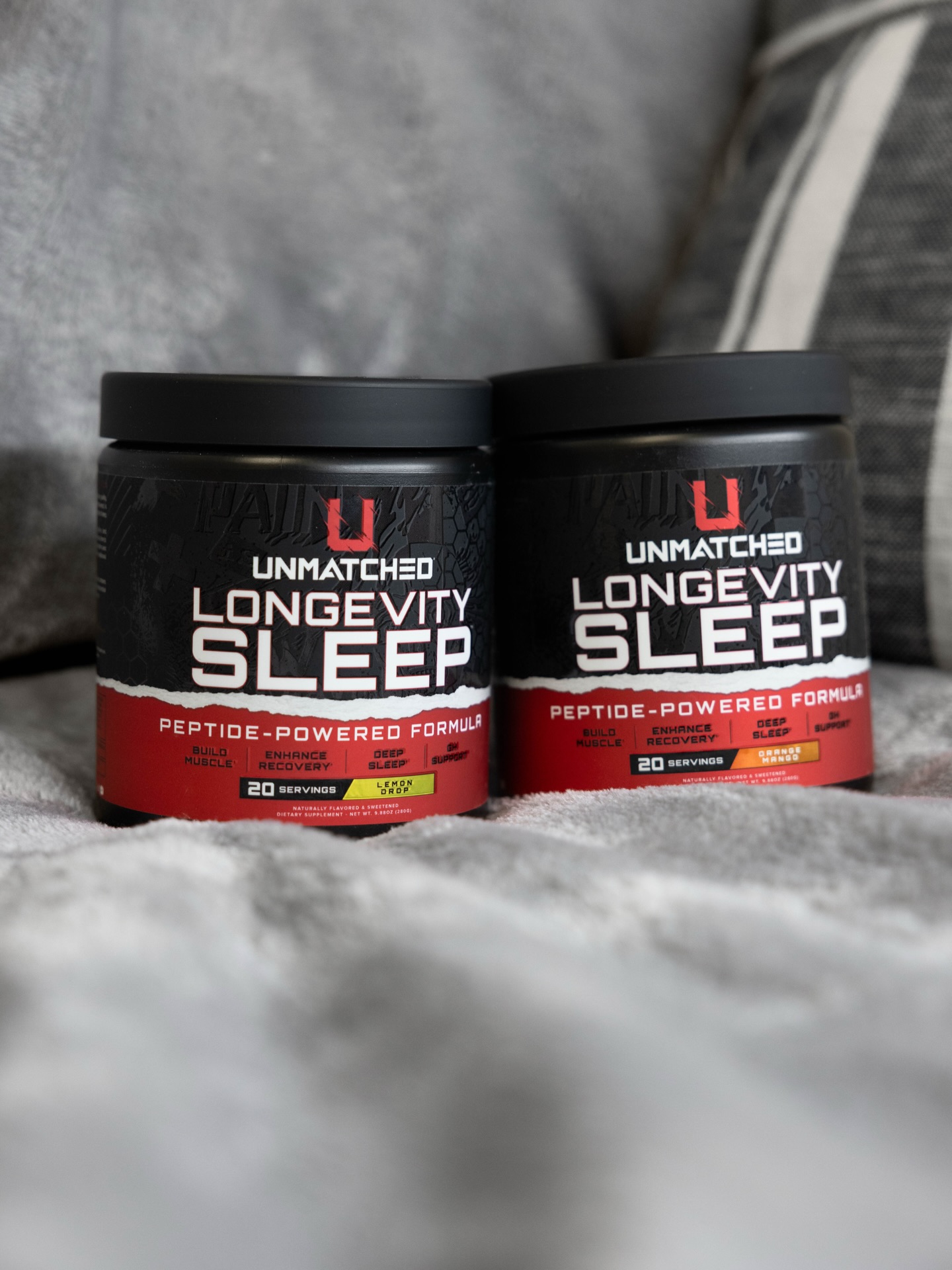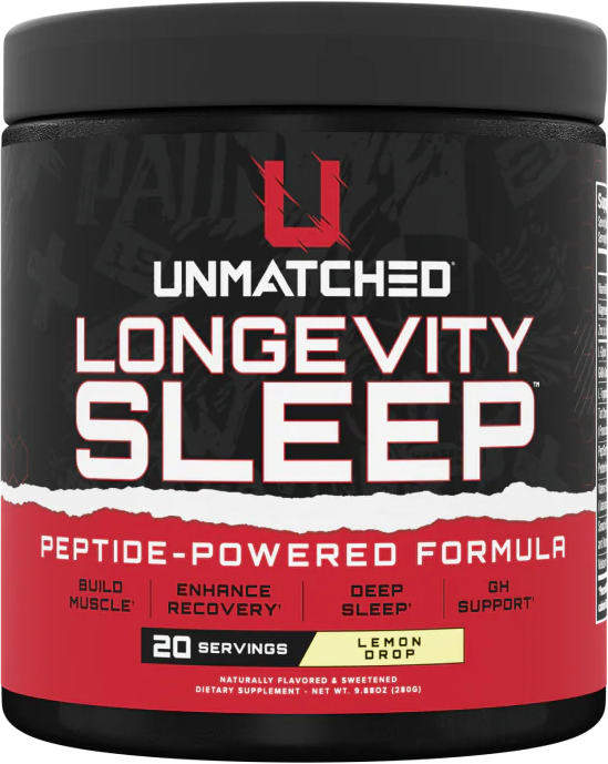 Unmatched Supps Longevity Sleep features 250mg PeptiSleep™ (AI-discovered peptide from Nuritas), 3g glycine, 3g GABA, tart cherry, Senactiv, and ZMA. Multi-pathway approach helps you fall asleep faster, stay asleep longer, and wake up recovered.