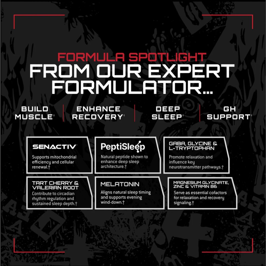 The formula layers traditional sleep aids like 3g glycine and 3g GABA with targeted recovery compounds including tart cherry extract and Senactiv®, a senolytic blend that supports cellular renewal. A clinical-strength ZMA blend (zinc, magnesium, B6) anchors hormone production and nervous system function, while 3mg melatonin helps reset circadian timing without excessive dosing.