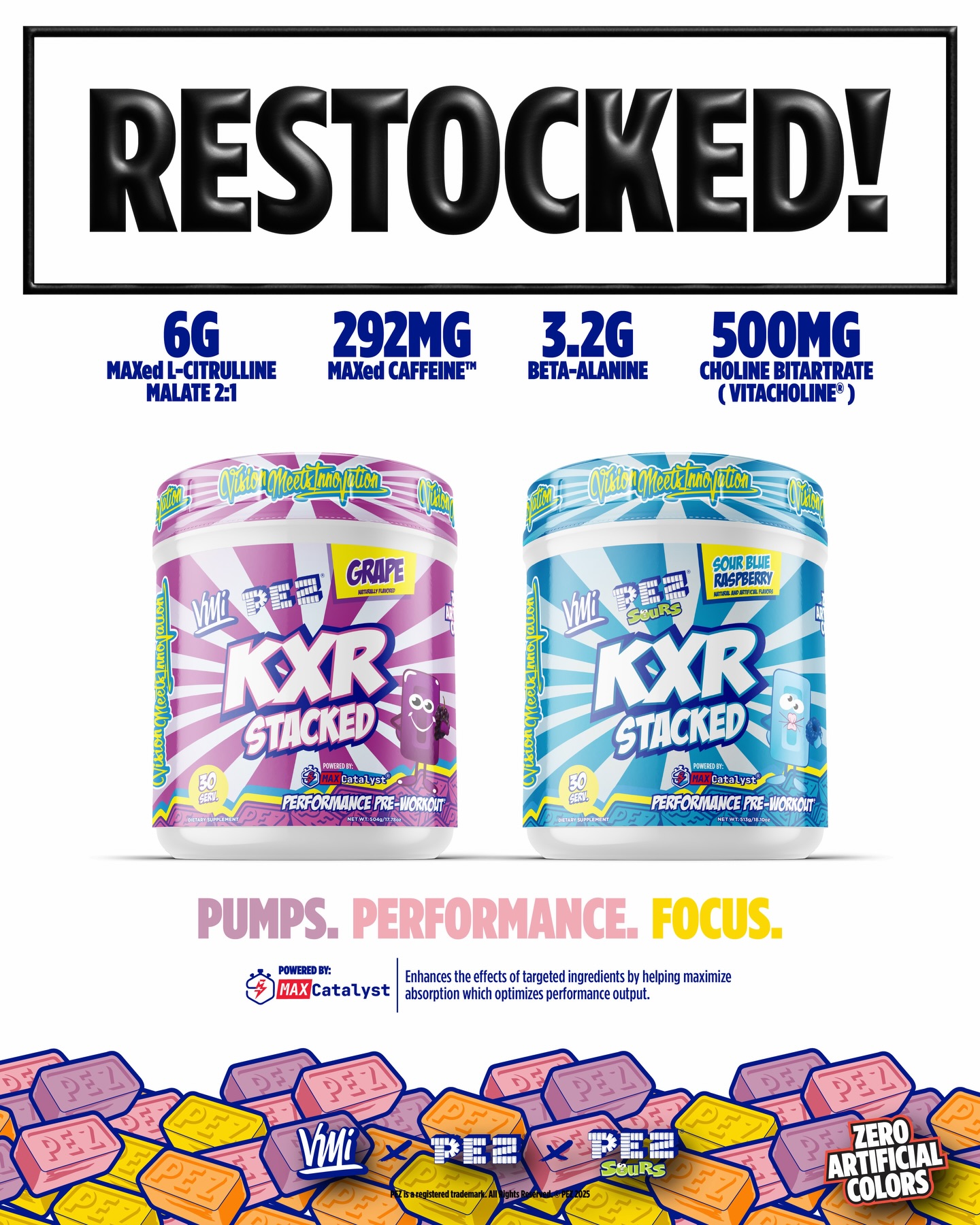 The PEZ Sours collaboration flavors make KXR Stacked one of the harder-looking tubs in the VMI lineup, too. If you've seen what VMI has done with PEZ across their carnitine and pump products, you know they take the flavor execution seriously.