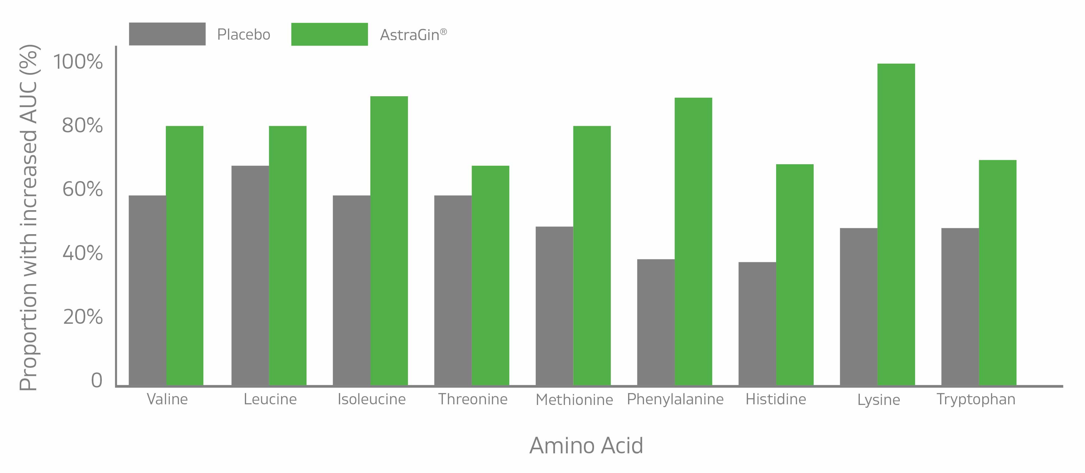 In adults aged 60 to 80, a greater proportion of AstraGin users showed increased AUC across all nine essential amino acids compared to placebo, with lysine reaching a 100% responder rate.[1]