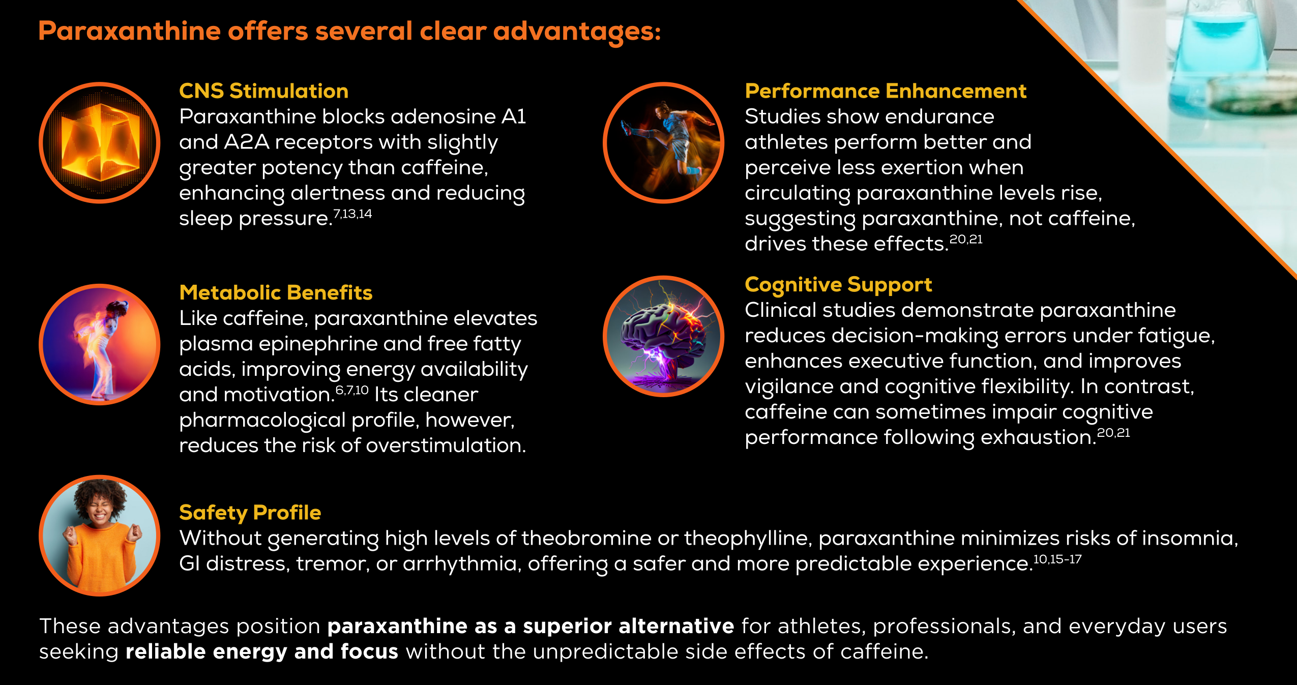 Earlier research demonstrated that paraxanthine reduced decision-making errors, enhanced executive function, and improved vigilance and cognitive flexibility under fatigue.[5]